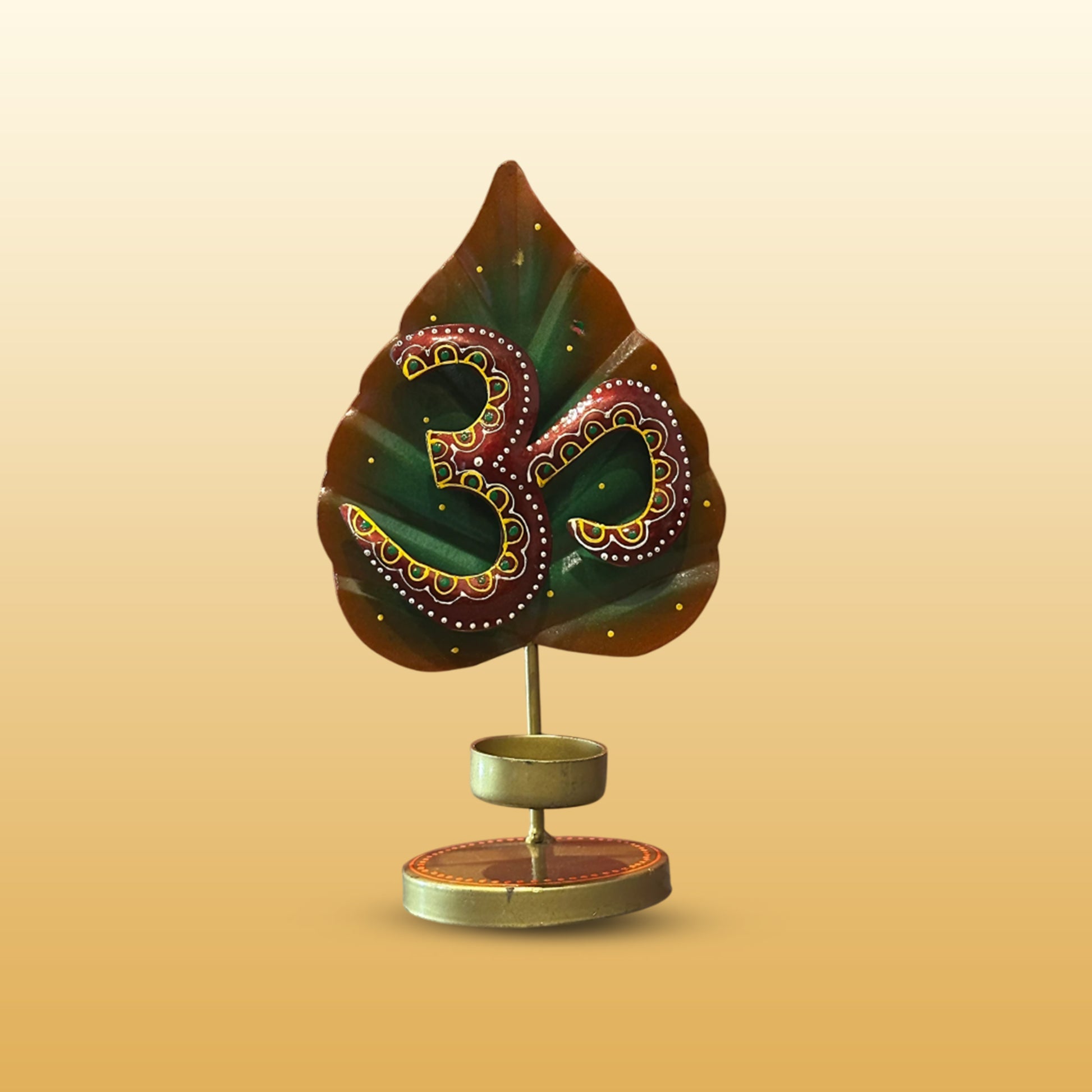 Bring home blessings and beauty with this intricately crafted Metal Leaf with T-Lite Holder. Featuring Lord Ganesh, Om & Krishna seated on a leaf-shaped metal frame, this piece is designed to hold a small tealight candle, adding a warm and divine glow to any space. Perfect for festive decor, housewarming gifts, or spiritual corners, it combines devotional symbolism with artistic elegance.